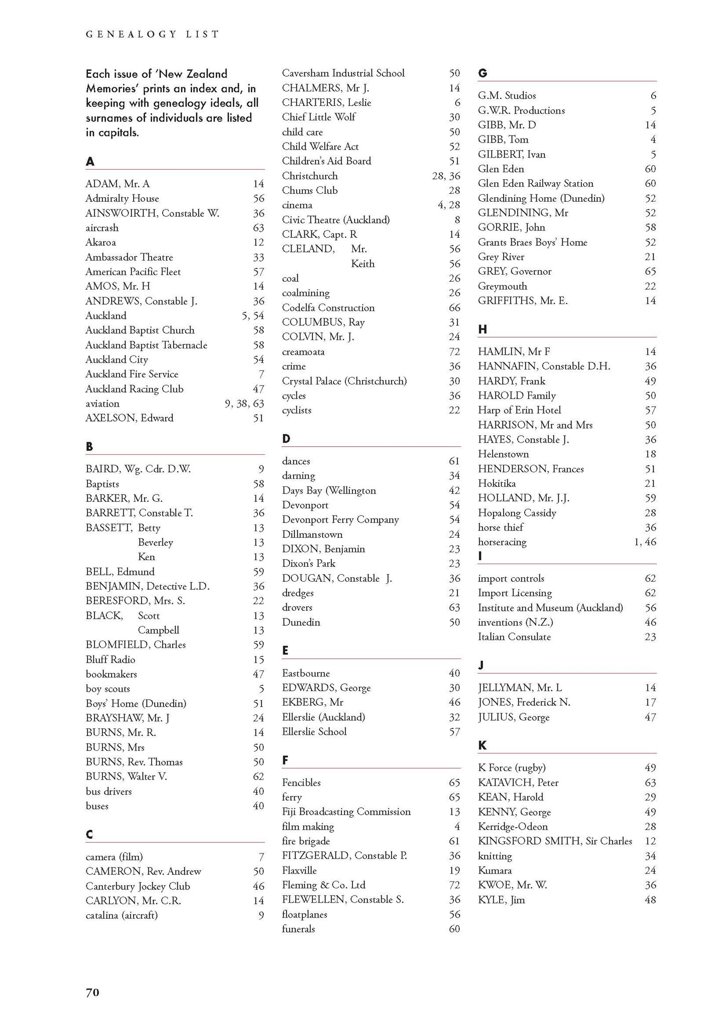 New Zealand Memories Issue 54 - Index