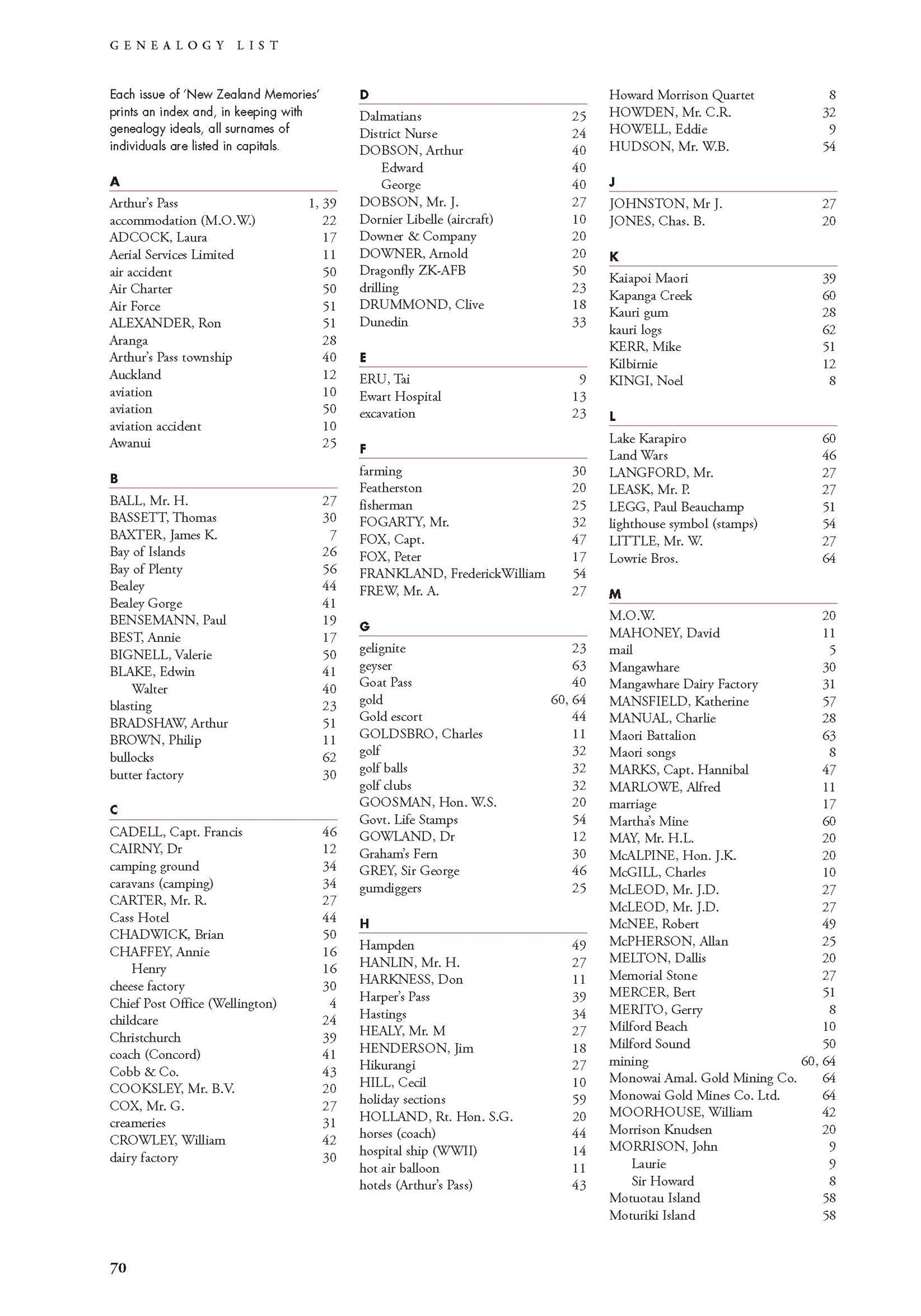 New Zealand Memories Issue 58 - Index