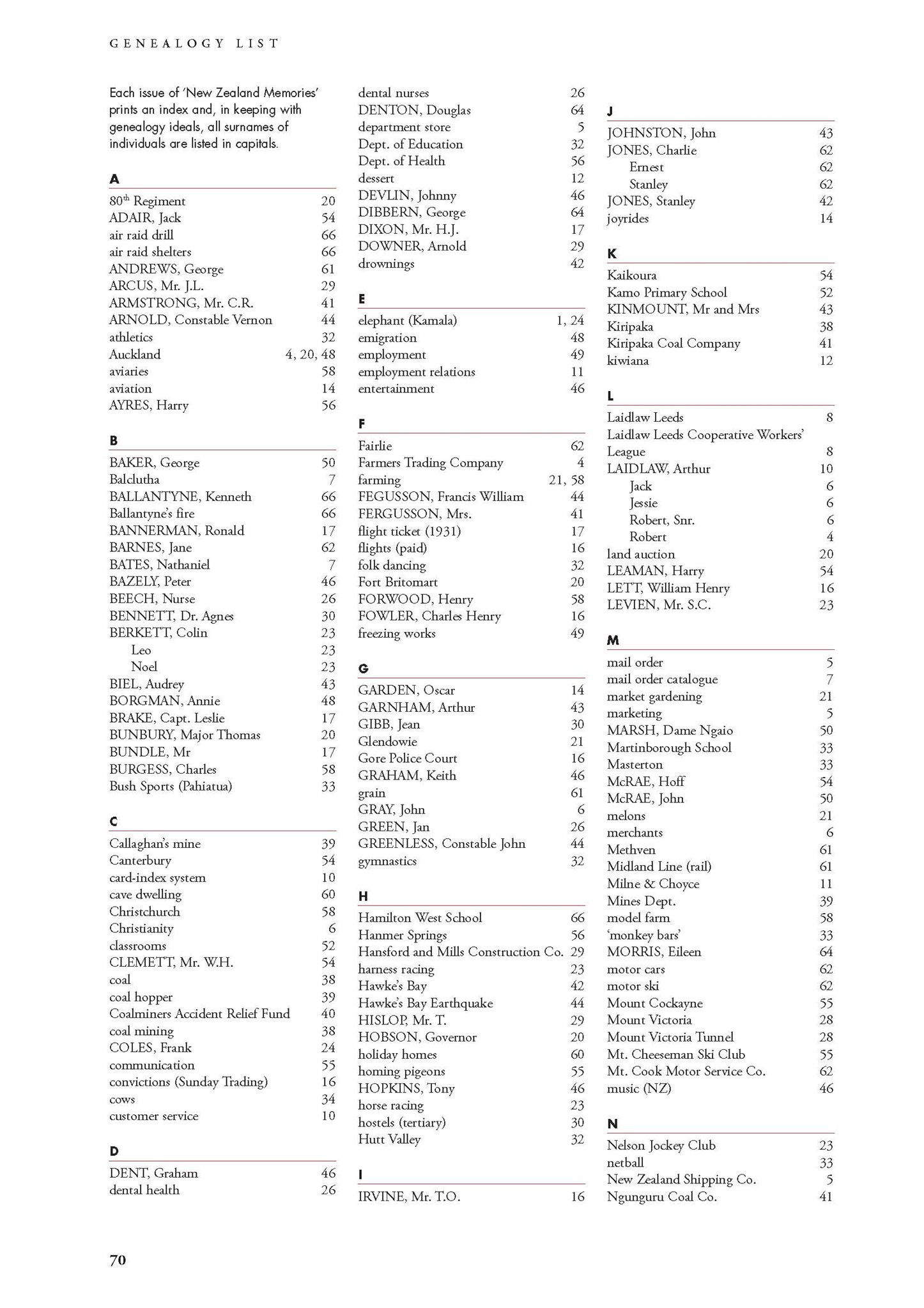 New Zealand Memories Issue 62 - Index